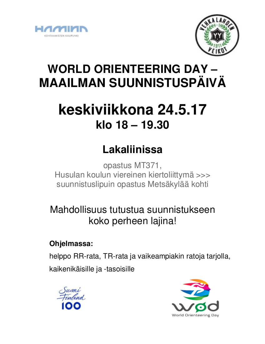 Keskiviikkona 24.5 vietetään kansainvälistä suunnistuspäivää. VeVe:kin on mukana yhdessä Haminan kaupungin kanssa tapahtumassa, tarjoamalla kaikille halukkaille mahdollisuuden tutustua suunnistukseen. Tapahtuma järjesetään Lakaliinissa lasten suunnistuskoulun yhteydessä. Tarjolla on helppoa RR- ja TR-rataa sekä tavallista suunnistusta yhdessä suunnistuskoululaisten kanssa. Paikan päällä mahdollisuus opastukseen. Tapahtuma sopii kaiken ikäisille ja jokainen on tervetullut tutustumaan hienoon lajiin.