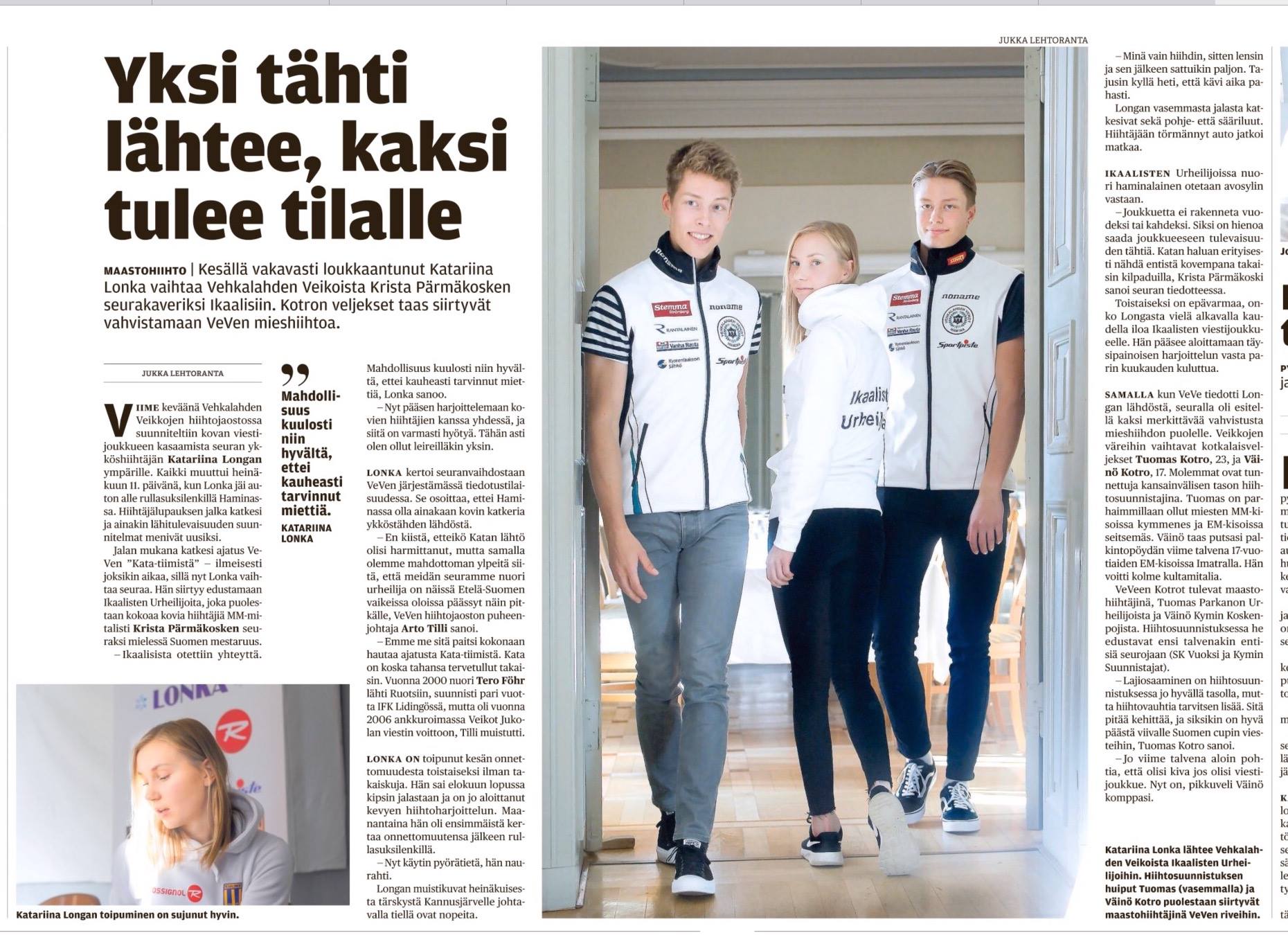 Tulijoina siis Kotron veljekset, Tuomas ja Väinö. Molempien päälaji tulee jatkossakin olemaan hiihtosuunnistus, jossa meriitit ovatkin jo melkoiset. Väinö (17) putsasi pöydän viime talvena nuorten EM-kisoissa kolmella voitollaan ja Tuomas on kisannut Suomen väreissä yleisen sarjan MM-kisoissa sijoittuen parhaillaan kymmenenneksi.