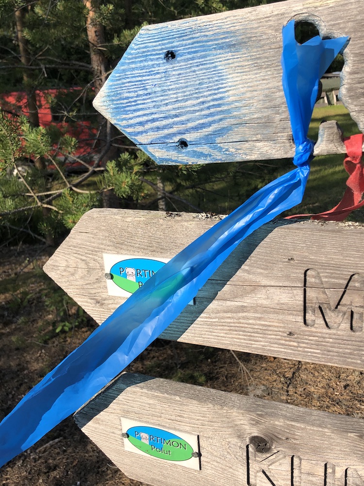 Reitti on merkitty maastoon sinisillä nauhoilla.