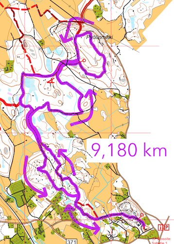Reitin pituus on kartalta mitattuna 9 180 metriä.